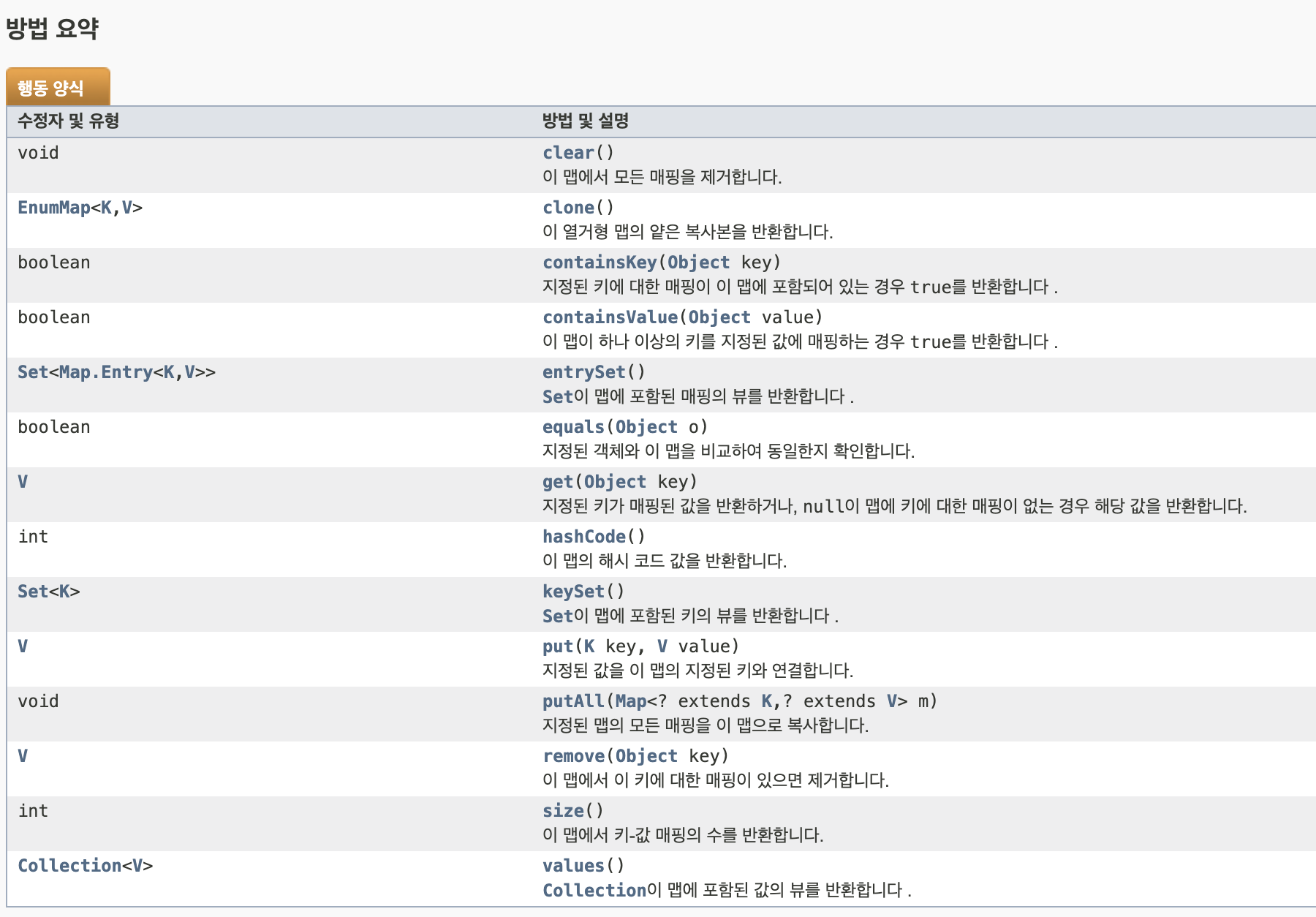 EnumMap의 고유 메서드는 다음과 같다.