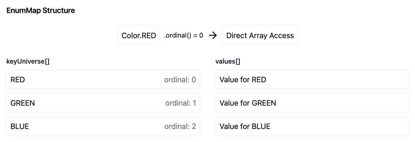 이러한 구조 덕분에 EnumMap은 enum 키에 대해 빠른 조회와 적은 메모리 사용량을 제공하며, ordinal을 통해 직접 배열 인덱싱하는 최적화가 가능해집니다.