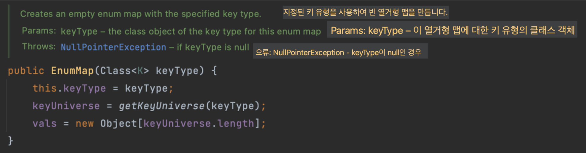 - 이후 (키, 값) 매핑을 넣게 될 때, keyUniverse[i](= i번째 enum 상수)에 매핑되는 실제 값은 vals[i]에 저장됩니다.