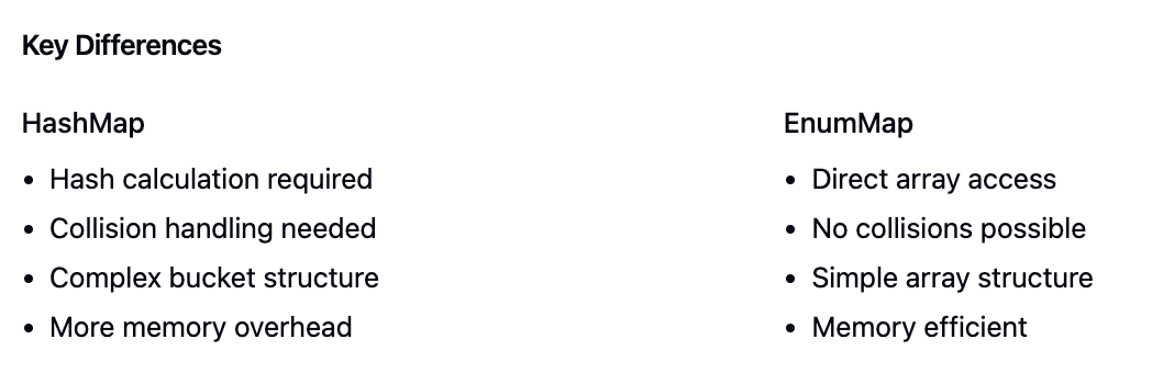 EnumMap이 HashMap보다 빠를 가능성이 큰 이유는 'hash 기반'이 아니라, 'enum 상수 배열 기반'으로 동작한다는 점에 있습니다. 즉, 키가 될 수 있는 enum 상수 개수가 고정되어 있고, 각 상수가 고유 ordinal()을 가지므로, 추가적인 해시 연산 없이 배열 인덱스로 바로 접근이 가능합니다.