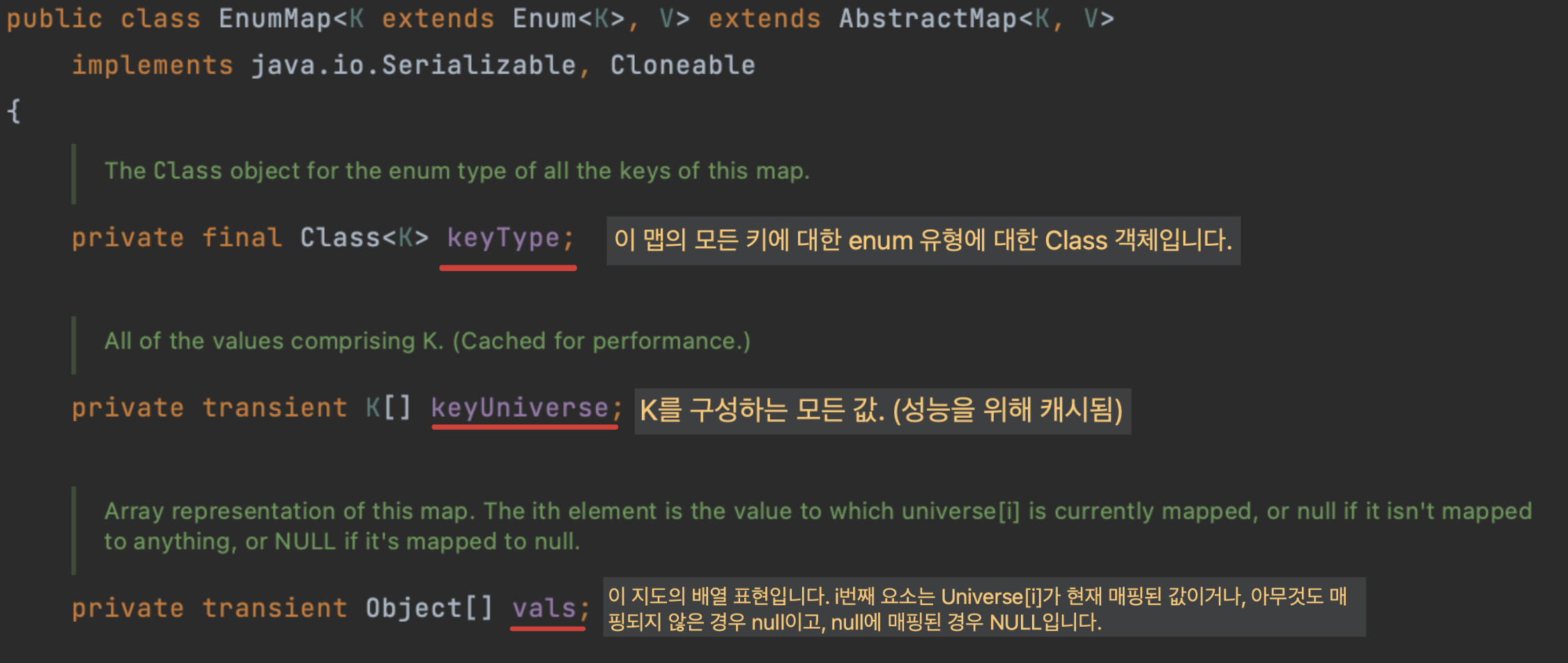 EnumMap의 주요 필드인 keyType, keyUniverse, vals는 각각 다음과 같은 목적을 가지고 존재합니다 :