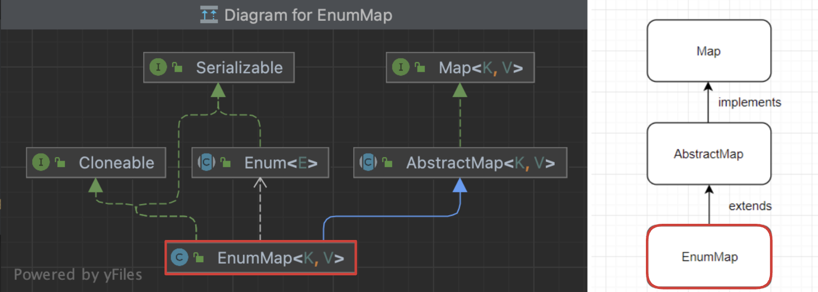 AbstractMap이 이미 Map 인터페이스를 구현하고 있기 때문에 EnumMap이 다시 Map을 implements 할 필요가 없다는 것을 코드로 보여줍니다.
