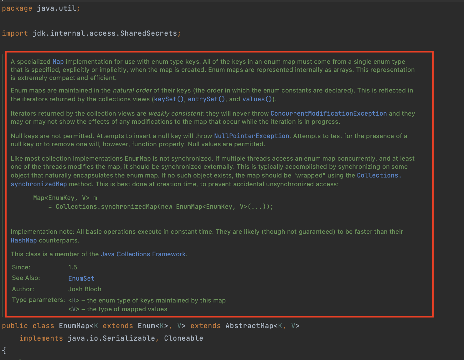 아래는 EnumMap의 선언부입니다. 보시다시피 HashMap과 마찬가지로 AbstractMap 클래스를 상속받고 있습니다. 다만, HashMap과 달리 Map 인터페이스를 직접 명시하여 implements하지는 않습니다.